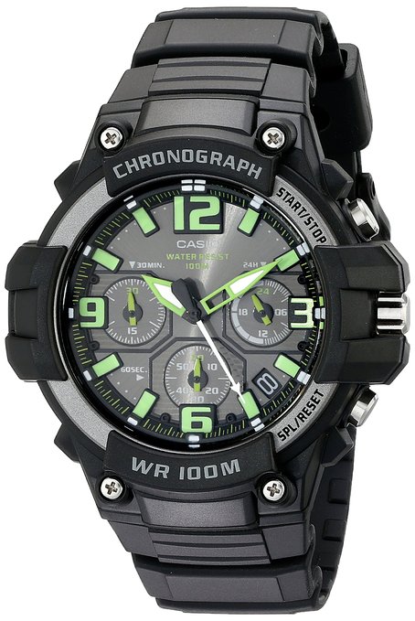这款卡西欧Casio男式MCW-100H-3AVCF Heavy Duty-Design精密计时黑色手表,内置太阳能电池,确保了时间的精准,无需额外能源,节能环保,46.2mm表径,非常大的表盘,适合粗手腕的纯爷们真汉子,指针显示,三眼计时,橡胶表带表盘耐摔耐磨!100米防水还是很靠谱的,足够应付日常生活。