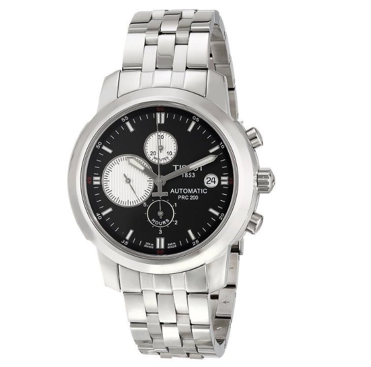 这款 天梭 Tissot PRC 200 Automatic Chronograph Black-White Dial Men's Watch #T014.427.11.051.01瑞士自动机械男表,采用瑞士自动机械机芯,防刮蓝宝石水晶表镜,黑色表盘,3点日历显示,夜光指针;三眼计时,金属银色表壳,防水达200米,外型精致,融入优雅时尚的顶级质感抛光表框与雾面处理表壳交错搭配,衬托出流行、立体的时尚感。夜光指针及刻度不仅便利目视,独特优雅的立体时刻面盘亦使色彩更加抢眼,长型指针设计,简单俐落大方,实用与时尚感兼具,高品味设计,让您休闲时刻、正式场合都能轻松搭配!