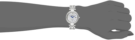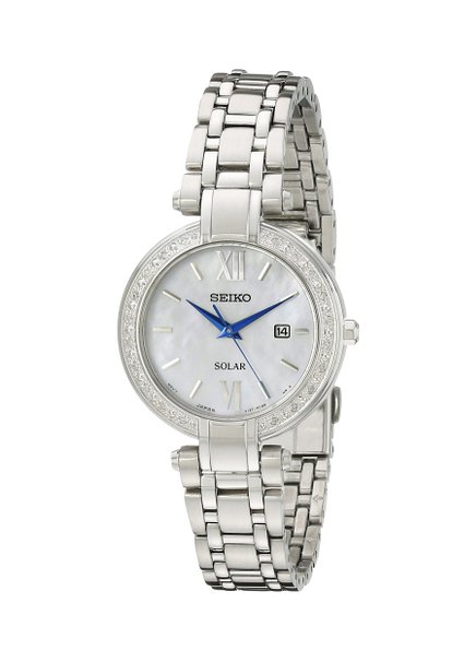 这款 Seiko SUT181 精工女士时尚石英手表,内置精确日本石英机芯,确保了时间的精准,外观采用银色全钢表壳表链设计,表框周围镶嵌水晶,晶莹剔透,奢华闪耀,防刮耐磨矿物玻璃表镜下为白色珍珠母贝表盘,表盘上镶有银色全时刻度,3点钟方向为日历显示窗,宝石蓝时分秒指针,表盘直径30mm,防水深度50m。