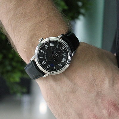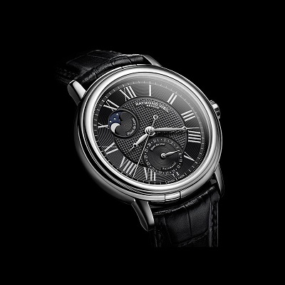 这款 Raymond Weil 2839-STC-00209 腕表是一款男士自动机械腕表,它39.5毫米的圆形表壳以精钢的材质打造,表壳流畅的圆形弧线上流动着闪耀的金属光泽。它的表盘颜色为黑色,表盘中央饰有点状的纹饰,使腕表焕发出了出众的文化气息,在表盘的10点钟位置,是腕表的月相显示盘,白色的月亮高悬在蓝色的夜空之中,在表盘的遮挡下忽隐忽现,向我们展示出了别样的诗情画意。盘面上的刻度采用了银色的罗马数字显示,又为腕表增加了一丝复古的气息,最后再配上一条黑色的短吻鳄鱼皮表带,使腕表获得了极佳的气质衬托效果。