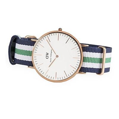 丹尼尔惠灵顿 Daniel Wellington 0108DW 男表,属于经典绅士系列,不锈钢表壳材质,高档石英机芯,材质用料十分十分良心。金属表壳厚度6mm,表盘直径40mm,表带宽度20mm,尼龙表带材质,蛋壳白字面颜色,30M生活防水。DW经典的彩色条纹帆布表带可更换,便捷针扣设计,针扣上刻有“DW”的LOGO。日本石英机芯,精简的北欧风格,精致中的简约,十分适合当代男性朋友,送礼自留都十分不错。