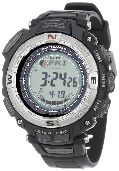这款Casio 卡西欧 Men's PAW1500-1V 登山系列电波太阳能表,多波段5局电波接收校时,太阳能充电系统, 国内话,可接收日本电波站,东部城市均可收到,西部等地可能就收不到了。内置方向感应器通过地磁进行罗盘指向、内置热敏电阻实现测温功能,内置测压感应器,测量当前气压值、通过内置硅片“阻力效应”感应当前高度;最高可以承受-10℃低温,带有月相显示显示 200米防水。单层LCD显示,13.9mm厚。 节能模式下可运行5个月。 200M防水。