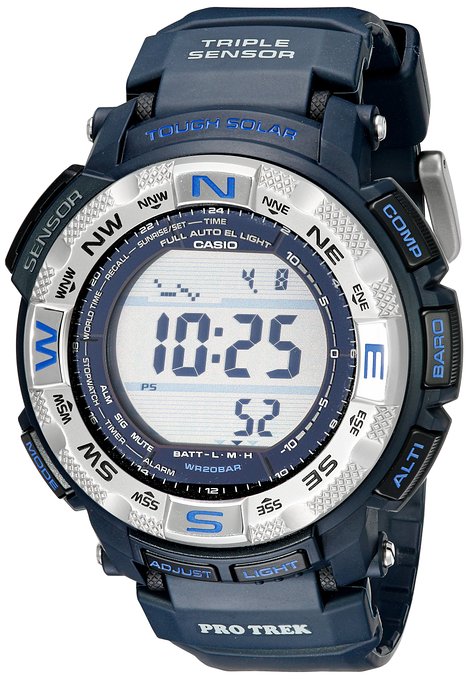 这款Casio Men's PRG-260-2CR Pro Trek Dark Blue Watch太阳能多功能手表,使用太阳能供电无需电池,充满电后最长可待机长达6个月。包括卡西欧全新升级的第三代三重感应器(数字高度计、气压计、温度计),以及数字罗盘,进一步减少了能量消耗并提高了测量精度。新增风暴警告功能,天气突变时,配戴者能第一时间知晓。可抵抗低温-10°C 。全自动EL背光,世界时间(48个城市),5组闹铃,1/100秒表功能等。表盘直径53mm,深蓝色表身,强化耐磨玻璃表镜,防水深度200米,表壳和表带均为树脂,非常轻而且不刺激皮肤。
