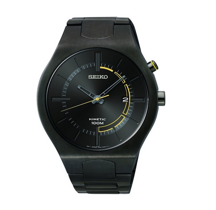 精工 Seiko Men's SKA649 Analog Display Japanese Quartz Black Watch 高端人动能男士手表,这款手表外形上非常的时尚前卫,金属黑色表盘表壳,具有运动范儿,表盘设计上搭配了半圈黄边,让整款手表视觉表现力更加强,秒针也设计成了黄色。在背景黑色的衬托下更加显眼,还具有100米防水的能力!表款采用Kinetic 人动能技术,其工作原理和传统机械手表一样,但是是飞陀带动转子给微型电机提供能量,即主要能够将佩戴时手腕摆动的动能转化为电能储存,也就是半机械半电子结构,也叫人动电能,既有石英表的精准,又有机械表的精密。
