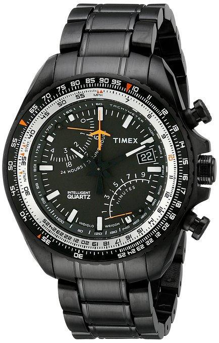 这款 天美时 Timex Men's T2P103DH Intelligent Quartz Aviator Fly-Back Chronograph Black Dial, Black Ion-Plated Stainless Steel Bracelet Watch 飞行员系列男款智能石英腕表,采用酷感黑色不锈钢表身,飞行风格计时表盘,指针带有飞返/逆跳效果,走完一圈后能逆向飞快弹回起点,视觉效果酷炫。内置专门研发的智能石英机芯,走时更加精确,带有日历显示、24小时计时等,Timex专利的Indiglo全盘均匀背光,夜间观看清晰舒适。表径46mm,防水100米。是一款功能和外观都不错的高性价比时尚表。