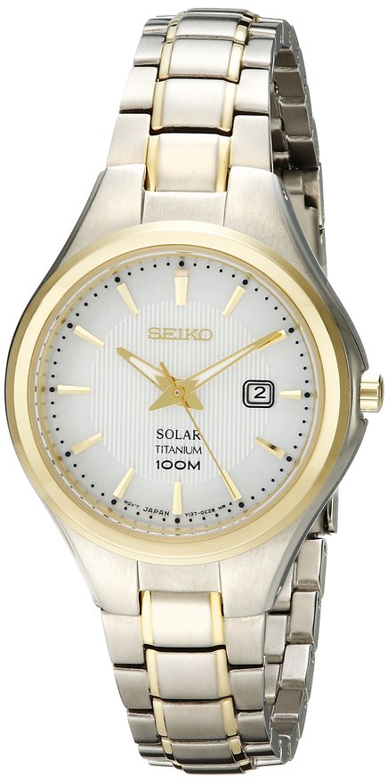 这款 Seiko SUT206 精工女士光动能石英手表 ,内置精确日本石英机芯,利用自然光供能,无需更换电池,节能环保,外观采用金银配色全钢表壳表链设计,尊贵典雅,气质非凡,防刮耐磨矿物玻璃表镜下为白色表盘,表盘上镶有金色全时刻度,边缘精确到秒,3点钟方向为日历显示窗,夜光指针方便夜间读取,表盘直径30.5mm,防水深度100m还是很靠谱的,应付日常生活不在话下。