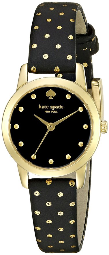 这款kate spade Mini Metro 凯特丝蓓女士时尚石英手表,内置优质石英机芯,保证了时间的精确,外观采用黑色皮质表带搭配金色不锈钢表壳设计,表带采用金点装饰,彰显高贵气质,防刮耐磨矿物玻璃表镜下为黑色表盘,表盘上镶有金色刻度和指针,表盘直径25mm,不防水。