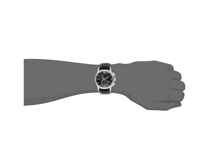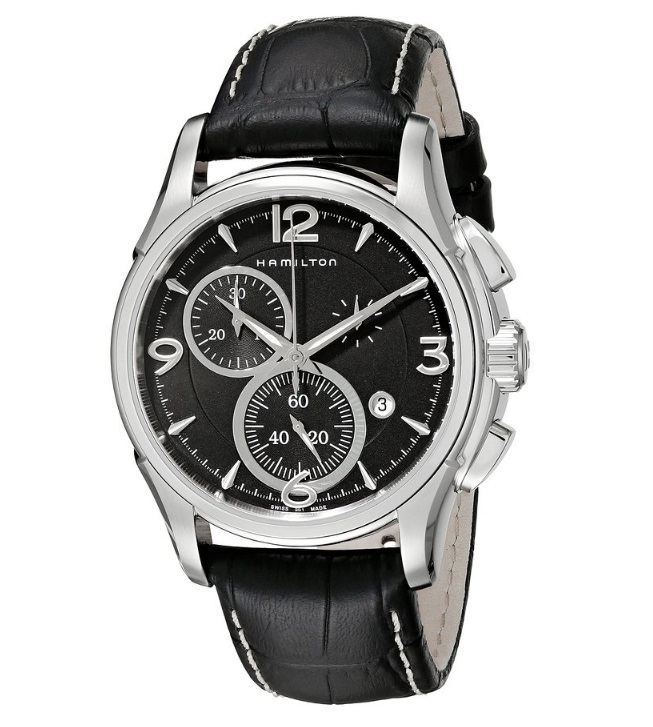 汉密尔顿 Hamilton Men's H32612735 Jazzmaster Black Chronograph Dial Watch 爵士瑞士制造计时多功能男表,这款来自汉密尔顿的腕表,内置一颗瑞士原产石英机芯,走时精准,基本不会出现时间误差,黑色表盘搭配银色不锈钢金属表壳,黑色皮革表带,气质典雅,三眼计时,颇具型男风范,4点处带有日期功能,蓝宝石水晶玻璃镜面,耐磨防滑,日常使用基本不会出现磨损,带有100米的防水功能,可以戴着游泳,12点下方有Hamilton的字母logo,象征品牌魅力!