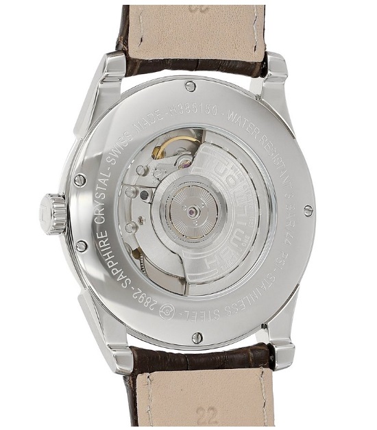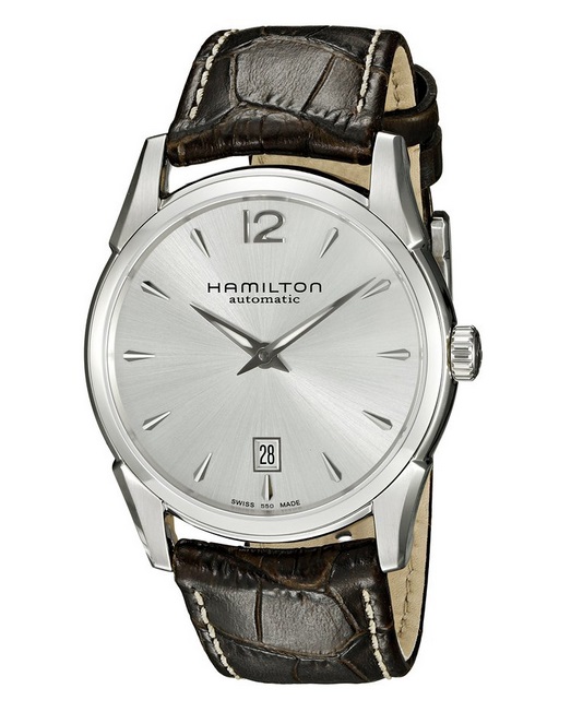 汉密尔顿Hamilton Men's H38515555 Jazzmaster Stainless Steel Automatic Watch with Brown Leather Band 爵士大师瑞士自动机械男表,此款男士腕表属于美式经典的爵士系列,延续了爵士系列的经典造型,外观典雅而大气。白色表盘无秒针的设计非常特别,日期窗口更是放到了六点位置。采用经典的瑞士自动上链ETA2892机芯,防划防眩蓝宝石水晶表镜,不锈钢表壳,表壳直径40mm,银色表盘配银色小时及分针,再加上棕色小牛皮表带,防水50米,可以戴着游泳。整体设计华丽低调,简约大气,无可挑剔,非常棒的一款机械腕表!