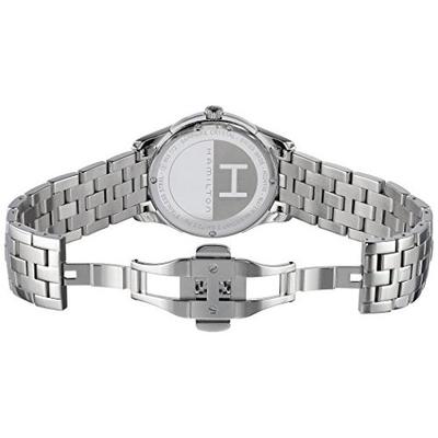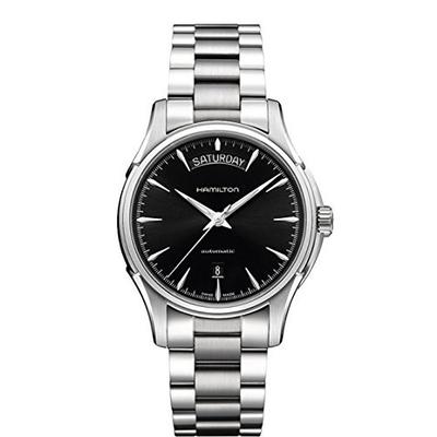 汉密尔顿Hamilton Men's H32411135 Jazzmaster Black Dial Watch 爵士大师瑞士制造双历时尚男表,本款属于经典的爵士大师系列,这个系列丝毫不逊色于卡其系列,生产的石英表以典雅高贵著称,适合商务人士使用,内置一颗瑞士石英机芯,走时十分精准,银色精钢表带+表壳,搭配黑色表盘,如利剑般的银色指针冷峻有型,指针上添加了夜光材质,38mm表径,比较纤细,一般商务用手表都是这个尺寸左右,如果太大比如43mm的话会显得过于突兀,破坏整体美感,蓝宝石水晶玻璃镜面,50米防水,可用于游泳及一般家务防水的手表,切记勿在水中调校表把。