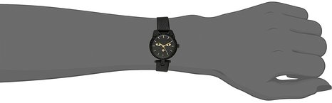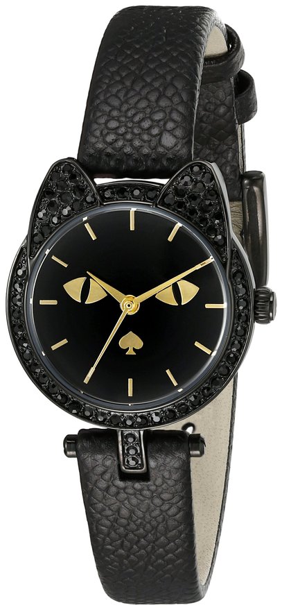这款kate spade 1YRU0817 女士时尚石英手表内置精确日本石英机芯,确保了时间的精准,外观采用黑色皮质表带搭配黑色不锈钢表壳设计,表壳造型为猫咪造型,颇具新意,可爱至极,防刮耐磨矿物玻璃表镜下为黑色表盘,表盘镶有金色全时刻度和指针,表盘直径26mm,防水深度30m。