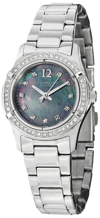 这款斯图灵Stuhrling Original 703B.02 女士时尚石英手表内置优质瑞士石英机芯,保证了时间的精确,外观采用银色全钢表壳表链设计,表框周围镶嵌水晶,晶莹剔透,奢华闪耀,防刮耐磨矿物玻璃表镜下为黑色珍珠母贝表盘,表盘上镶有水晶刻度,夜光指针方便夜间读取,表盘直径30mm,防水深度50m。