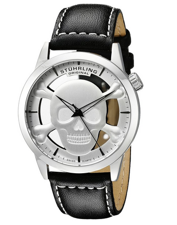 这款爆降 Stuhrling Original 男士时尚手表内置优质石英机芯,保证了时间的精确,外观采用黑色真皮表带搭配银色不锈钢表壳,经典,防刮耐磨矿物玻璃表镜下为白色镂空表盘,表盘镶有银色骷髅的标志,很是时尚,也是此表卫衣特别的亮点,可能喜欢的朋友会因为骷髅一眼就看上它,黑色时分秒指针,表盘直径42mm,防水深度50m还是很靠谱的,总的来说是一款非常时尚的一块手表!值得入手!