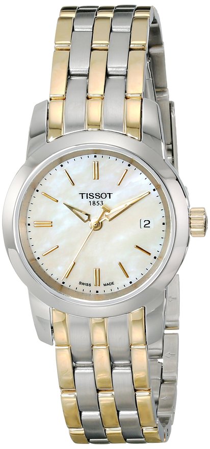 这款Tissot T0332102211100典雅珍珠母贝瑞士石英女表,采用精准瑞士石英机芯,确保了时间的精准,防划防眩蓝宝石水晶表镜,不锈钢表壳搭配金银两色精钢表链,典雅珍珠母贝表盘搭配金色指针及刻度时标,3点钟位置日期显示;表壳直径28 毫米,厚度8毫米,防水30米。设计非常简约优雅!