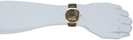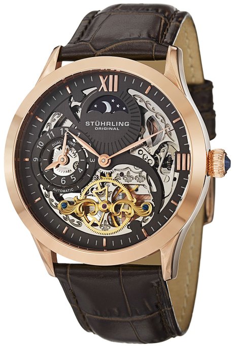 这款Stuhrling 斯图灵 Original Men's 571.3345K54 男士月相机械手表 ,内置优质机械机芯,保证了时间的精确,外观采用棕色鳄鱼皮带搭配16k镀金不锈钢表壳,防刮耐磨矿物玻璃表镜下为黑色镂空表盘,透过表盘可以看的机械运作, 非常的精致,表盘镶有金色全时刻度,看上去相当高贵,表壳直径44mm,防水深度50m。
