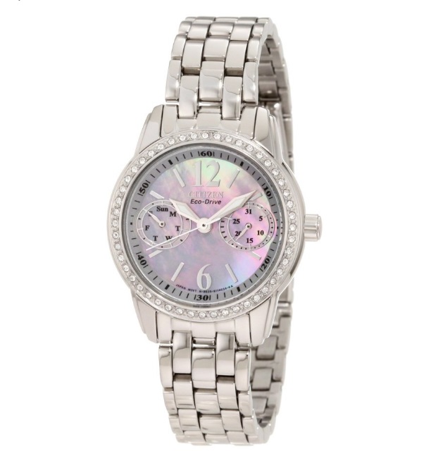西铁城 Citizen Women's FD1030-56Y Swarovski Crystal-Accented Stainless Steel Eco-Drive Watch 女士光动能石英手表,采用不锈钢材质制造,表盘直径为27.5毫米,防水达到了100米。同时,配备西铁城自家的Eco-Drive2.0光动能技术,手表无需更换电池保持暴露在阳光中即可正常使用。光动能是西铁城的核心技术,光动能手表吸收任何可见光源并转化成动能带动手表持续运。光动能手表采用的是寿命达到15-20 年左右的长寿命型充电电池,因此技术可靠,经久耐用。支持日月的显示。粉红色的表盘配上一圈的镶钻,非常的华丽、闪耀。