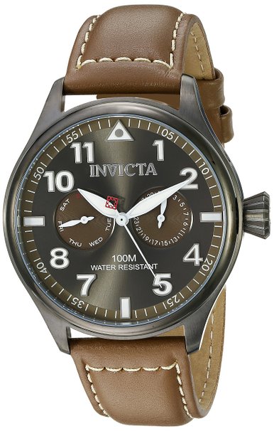 这款 别克展望 Invicta 18513SYB I-Force 男士石英手表 ,内置优质瑞士石英机芯,保证了时间的精确,外观采用褐色真皮表带搭配黑色不锈钢表壳设计,经典优雅,气质非凡,防刮耐磨矿物玻璃表镜下为灰色表盘,表盘镶有夜光全时刻度和指针,边缘精确到秒,双眼日历副表盘,表盘直径45mm,防水深度100m,应付日常生活不在话下。