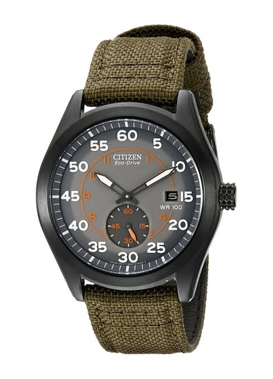 这款Citizen 西铁城 BV1085-22H Eco-Drive 光动能男士手表 ,采用光动能石英机芯,确保了时间的精准。黑色表盘搭配银色橙色夜光数字时标和指针,日期显示,小秒针在6点钟位置,矿物质玻璃表镜,黑色不锈钢表壳,绿色帆布表带。表径45毫米,100米防水还是很靠谱的,应付日常生活不在话下。