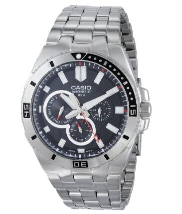 这款Casio卡西欧男款潜水表的型号为MTD-1060D-1AVDF,整个表身采用银色不锈钢材质,黑色表盘中有三眼指针三个指针分别显示星期日期和24小时制,极富运动感,机芯采用的是精准的石英机芯,荧光指针能在黑暗中也看到时间,这款表的表盘直径为47mm,算是比较大的了,表的厚度为11mm,防水尺寸为100米,足够应付日常生活。