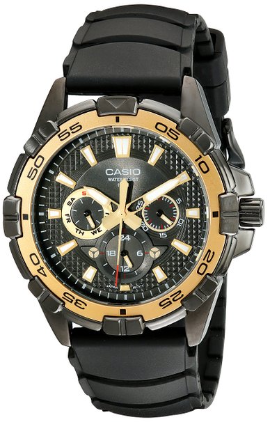 这款Casio卡西欧MTD1069B-1A1男士运动手表,采用矿化玻璃镜面,不锈钢表壳,外表圈电镀黑离子图层,冲击孔面板设计表盘,夜光显示,读时清晰。内置日本石英机芯,确保了时间的精准,精确度为每月时差约±20秒。三眼显示,12点显示日期、9点显示星期、6点显示24小时。表径45.8mm,厚11.8mm,防水100米还是很靠谱的,应付日常生活不在话下。