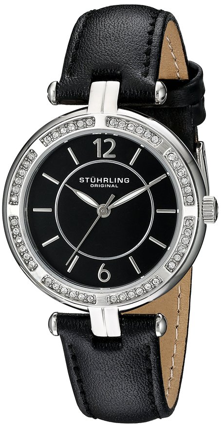 这款Stuhrling Original 550.02 Vogue 斯图灵女士时尚石英手表,内置精确石英机芯,确保了时间的精准。外观采用黑色皮质表带搭配银色不锈钢表壳设计,表壳边缘镶嵌水晶,晶莹剔透,奢华闪耀,防刮耐磨矿物玻璃表镜下为黑色表盘,表盘镶有银色全时刻度,夜光指针方便夜间读取,表盘直径33.4mm,防水深度50m,足够应付日常生活。