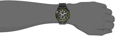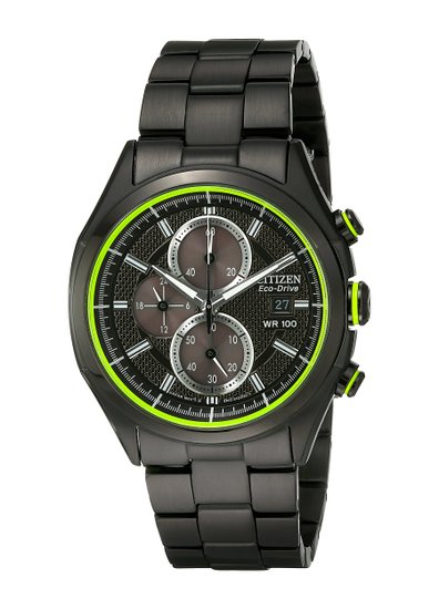 这款西铁城Citizen CA0435-51E男士光动能手表,内置精确日本Eco-Drive光动能机芯,利用自然光供能,无需更换电池,节能环保,采用离子镀黑的不锈钢表壳和表带设计,表圈处有一圈荧光绿装饰,防刮耐磨矿物玻璃表镜下为黑色表盘,3点钟日历显示,夜光刻度和指针,三眼计时副表盘,表盘直径41mm,防水深度100m,应付日常生活不在话下。