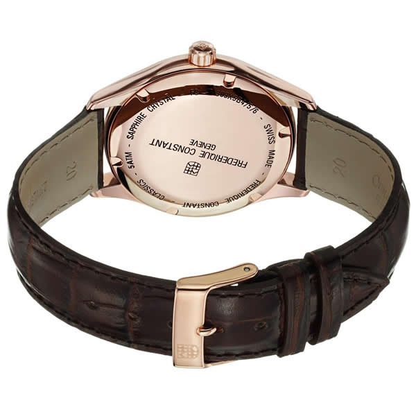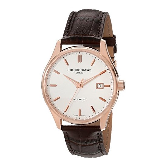 这款Frederique Constant Index Analog Display Swiss Automatic Brown Watch康斯登男士手表型号为FC-303V5B4,这款表属于康斯登的Classics经典典雅系列,这款表的机芯采用的是采用FC303自动机械机芯,这款机芯改良自SW200机芯,机芯搭载有26颗红宝石,并且具有38小时的动力储备,走时肯定也是不用说的,十分精确,机芯的表现可谓相当强劲。白色表盘搭配镀玫瑰金条形时标再加上大三针的经典造型,造型典雅又大方,表镜采用的是蓝宝石水晶,防炫目又防刮,表壳采用的是镀18K金的不锈钢,皮质表带上面有鳄鱼纹,表径为40毫米,厚度10毫米,50米防水足够日常生活。