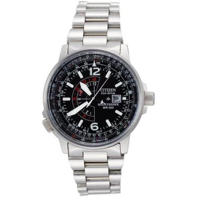 Citizen 西铁城 Nighthawk 夜鹰系列 BJ7000-52E 男士光动能手表,这款是西铁城Nighthawk夜鹰系列下的热门表款,型号为BJ7000-52E,采用B877机芯,光动能驱动,无论是日光还是室内光源都可为其充电,最大电力储备180天,具有电力保护和低电量指标窗口。不锈钢表壳表带,41mm表盘直径,耐磨抗反光矿物玻璃表镜,GMT双时间显示功能,强力夜光指针,夜光效果相当酷。可通过表冠操作表圈8点方位的飞行员飞行计算尺,3点钟方向日期显示,并有Nighthawk夜鹰logo。200米防水。