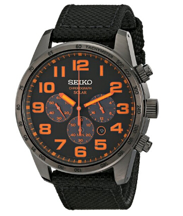 这款Seiko Sport Solar Analog Display Japanese Quartz Brown Watch精工男士光动能运动手表型号为SSC233,机芯采用的是日本产太阳能石英机芯,利用自然光供能,不用更换电池,节约省事并且十分环保,而且精确性肯定不用说了,这款男表表带采用针织材质,加上黑色大表盘和中间橙色的指针,三眼以及数字,帅气十足。表镜采用的是防刮耐磨的矿物玻璃材质,4-5点钟之间带有日历显示窗,外圈为360度罗盘,表盘直径Wie44.5mm,防水深度为100m,日常生活足够了。