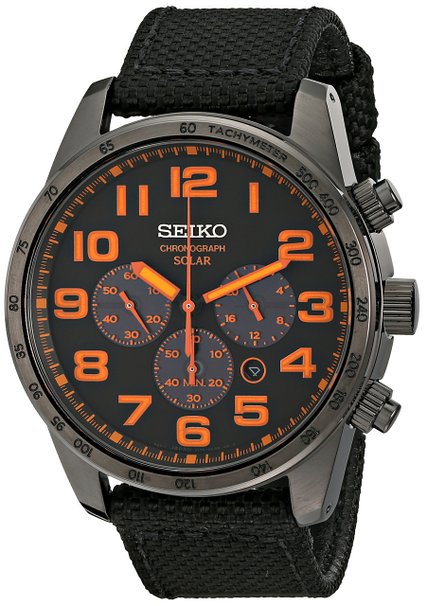 这款 Seiko SSC233 Sport 精工男士光动能运动手表,内置精确日本石英机芯,利用自然光供能,无需电池,节能环保,外观采用织物表带搭配黑色不锈钢表壳设计,酷劲十足,防刮耐磨矿物玻璃表镜下为黑色表盘,表盘上镶有橙色刻度和指针,4-5点钟之间带有日历显示窗,三眼计时副表盘方便夜间读取,表盘直径44.5mm,防水深度100m还是很靠谱的,足够应付日常生活。