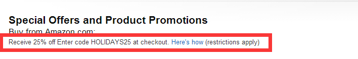 结账页面输入优惠码:“HOLIDAYS25”即可享受额外75折!注意仍仅限美亚自营类商品(Offer only applies to products sold and shipped by Amazon.com),如下图: