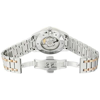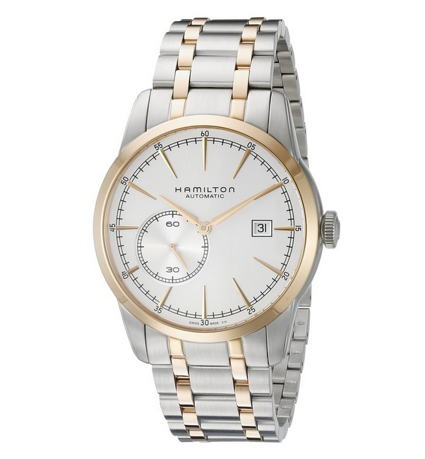 汉密尔顿 Hamilton Men's H40525151 American Classic Railroad Analog Display Swiss Automatic Two Tone Watch 美国经典系列自动机械男士腕表,这款是来自汉密尔顿的一款机械手表,外观上采用了银色不锈钢表壳镶嵌金边的设计,表带上也采用了淡金色,整款手表典雅气质,十分高档,圆形表盘42mm直径,大小适中,多数男士的手腕皆可佩戴,3点处有日期功能,还带有一个副表盘,内置瑞士原产自动机械机芯,防水深度有100米,能够戴着游泳!