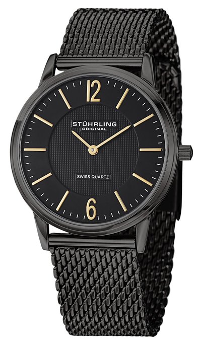 这款 Stuhrling 122.33551 Classic Ascot 男士超薄石英手表,内置优质瑞士石英机芯,保证了时间的精确,外观采用黑色不锈钢表壳表链设计,酷感十足,防刮耐磨矿物玻璃表镜下为黑色表盘,表盘镶有金色刻度和指针,表盘直径38mm,防水深度50m还是很靠谱的,应付日常生活不在话下。