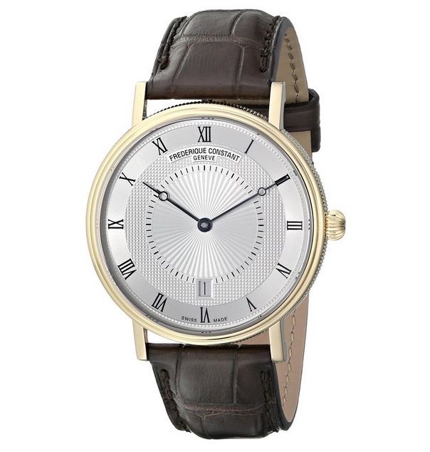 康斯登 Frederique Constant Men's FC306MC4S35 Slim Line Gold-Tone Stainless Steel Watch with Brown Leather Band 超薄瑞士自动机械男表,康斯登——瑞士名表品牌,创立于1980年代末期,定位于「可触及的奢华」,档次比浪琴价位略低一些。以极其简约的设计风格见长,纯净无多余点缀却又让人一见倾心。这款腕表采用精准瑞士自动机械机芯,防眩防划蓝宝石水晶镜面,罗马数字标时配独特两针;抛光金色精钢表壳,棕色短吻鳄鱼皮表带,6点钟日期显示;表壳直径39毫米,30米防水。