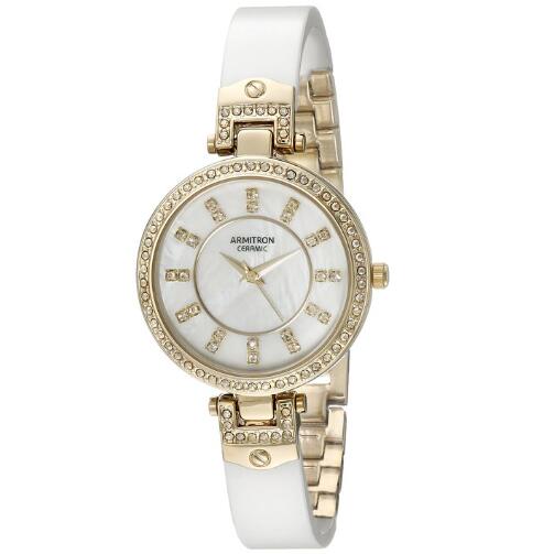 这款Armitron 阿美神 Women's 75/5313MPGPWT Swarovski Crystal Accented Gold-Tone and White Ceramic Bangle Watch 施华洛世奇水晶 女士陶瓷腕表,表表圈外部和指针处都镶有施华洛世奇水晶,以及珍珠母贝表盘,看上去华丽夺目,陶瓷表带,更加优雅。圆形表盘,折叠式安全表扣,表盘大小为30mm,可防水50米。