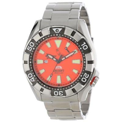 ORIENT 东方双狮 SEL03002M0M-Force 男款潜水机械表,此款M-Force系列的潜水机械表,使用不锈钢表壳跟表链,蓝宝石镜面,防水深度达200米,表盘直径为46mm,厚度13mm;拥有便于在水下较暗环境读取时刻的夜光指针和刻度,旋入式表冠能起到更好的防水作用,带有深橙色跟黑色可以旋转的两圈表盘,外表圈的分钟刻度可以用来提醒潜水时间。自动机械表芯,2点钟方向有动力储存显示,9点种方向有日期显示,拥有自动上链和手动上链等附加功能。整体外观显得大气稳重。