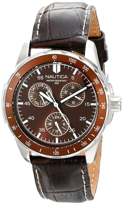 这款诺帝卡Nautica N09550G Windseeker 男士石英手表内置精确日本石英机芯,确保了时间的精准,外观采用真皮表带搭配不锈钢表壳设计,防刮耐磨矿物玻璃表镜下为褐色表盘,表盘除了显示时间外,还能显示日期、星期。表盘直径38mm,防水深度50m,无论送礼还是自留都是不错的选择。