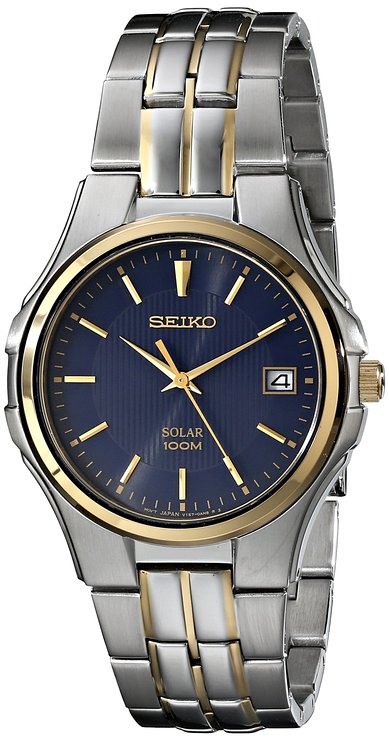 这款Seiko SNE124 精工男士光动能石英手表 ,内置日本光动能石英机芯,利用自然光供能,无需电池,节能环保,外观采用金银配色不锈钢表壳表链设计,尊贵典雅,气质非凡,防刮耐磨矿物玻璃表镜下为蓝表盘,表盘镶有金色全时刻度和指针,3点钟方向为日历显示窗,表盘直径22mm,防水深度100m。