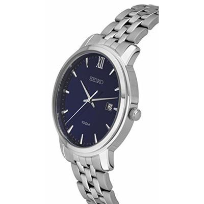 这款Seiko SUR117 精工男士全钢石英手表,内置精确日本石英机芯,保证了时间的精确,外观采用银色全钢表壳表链设计,沉稳优雅,气质非凡,防刮耐磨矿物玻璃表镜下为宝石蓝表盘,表盘镶有银色全时刻度,边缘精确到秒,3点钟方向为日历显示窗,银色时分秒指针,表盘直径42mm,厚度8mm,十分轻薄。防水深度100m还是很靠谱的,足够应付日常生活。