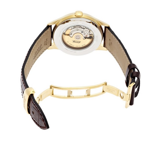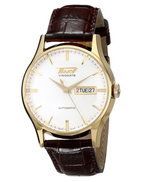 天梭 Tissot Men's TIST0194303603101 Visodate Gold-Tone Stainless Steel Watch 唯思达系列男士自动机械腕表,追溯到20世纪50年代,当时,天梭以一系列创新庆祝其百年庆典——其中之一,便是一款能将日期功能整合到自动机制之中的名为唯思达的腕表。天梭唯思达系列以细致入微的当代设计,传递着对那个时代的眷恋之情。拱形表盘采用了圆弧形蓝宝石玻璃表镜,能够清晰的显示日期。具体到这款手表,镀金表壳表径40毫米,搭配一条棕色的真皮表带,白色表盘搭配条形时标,相当经典儒雅的正装表。采用 ETA 2836-2自动机械机芯,动力储备40小时,与ETA经典的2824-2相比多了星期显示,同样属于皮实耐用的经典机芯。蓝宝石水晶玻璃表镜。30米生活防水。