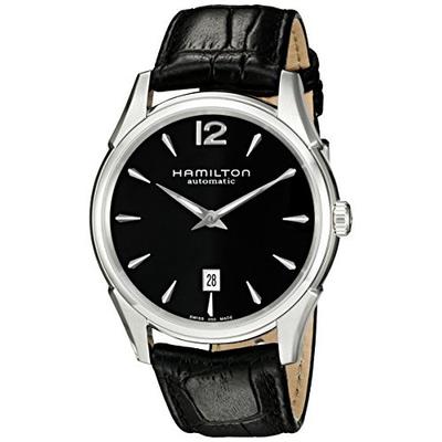 汉密尔顿Hamilton Men's H38615735 Jazzmaster Slim Black Dial Watch 爵士大师爵士瑞士自动机械超薄男款腕表,此款男士腕表属于美式经典的爵士系列,延续了爵士系列的经典造型,外观典雅而大气。黑色表盘无秒针的设计非常特别,日期窗口更是放到了六点位置。采用经典的瑞士自动上链机械机芯,防划防眩蓝宝石水晶表镜,不锈钢表壳,表壳直径43mm,适合多数男士的手腕粗细,黑色表盘配银白色小时及分针,再加上黑色小牛皮表带,防水30米,可以应付日常生活中的下雨以及溅水。整体设计华丽低调,简约大气,无可挑剔,非常棒的一款机械腕表!