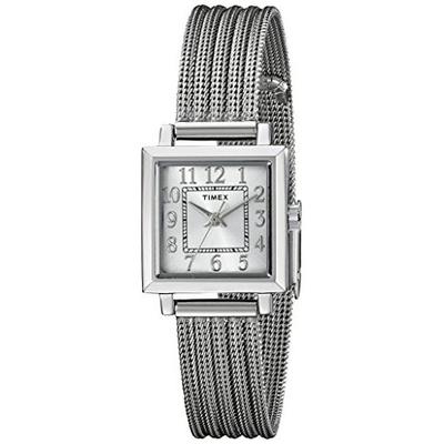 天美时 Timex Women's T2P4399J Main Street Modern Minis Silver-Tone Watch 女款石英手表,采用石英机芯,时尚的银色链条式表带设计简约大气,不管身处何方都是众人中的焦点!银色表壳采用金属材料,结实耐用,外加白色表盘上银黑色指针和数字,显得时尚精致,能够为佩戴者增色不少,细细的指针与数字刻度搭配相当合适。外壳直径21毫米,厚度7毫米,属于超薄系列,12毫米宽度的不锈钢表带配带舒适,适合手腕较细的女生佩戴。平时用来计时和日常搭配还是很不错的。