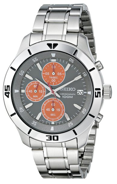 这款SEIKO 精工 三眼计时男表 SKS415 ,采用日本的MOV.T 4t57石英机芯,三眼表盘,时针、分针和刻度为银色,其他指针为稍显跳跃的红色,采用银色不锈钢表壳和表带,3点钟日期显示,0.1秒,60秒和60分计时功能,带计时按钮,表盘直径42mm,厚度10.7mm,耐磨Hardlex表镜,防水100米。款式大气,动感十足。