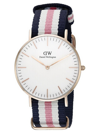 这款Daniel Wellington Classic Southhampton Stainless Steel Watch With Multi-Color Striped Band丹尼尔·惠灵顿女士腕表型号为0506DW,沿用了DW家一贯的简洁表盘设计,甚至连秒针都省略了,更显得从容大方,内置一颗日本石英机芯,保证走时精确。表盘内表针包括刻度都使用玫瑰金色,配色白色的表盘更显得文艺小清新。表带还是采用了帆布表带,粉蓝白相间更加小清新,表径为36mm,厚度6mm。30米防应付日常生活不在话下。