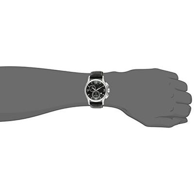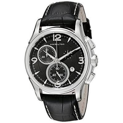 汉密尔顿 Hamilton Men's H32612735 Jazzmaster Black Chronograph Dial Watch 爵士瑞士制造计时多功能男表,这款来自汉密尔顿的腕表,内置一颗瑞士原产石英机芯,走时精准,基本不会出现时间误差,黑色表盘搭配银色不锈钢金属表壳,黑色皮革表带,气质典雅,三眼计时,颇具型男风范,4点处带有日期功能,蓝宝石水晶玻璃镜面,耐磨防滑,日常使用基本不会出现磨损,带有100米的防水功能,可以戴着游泳,12点下方有Hamilton的字母logo,象征品牌魅力!