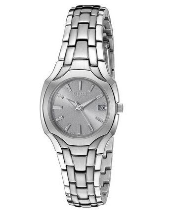 这款Citizen Women's EW1250 Watch西铁城女士光动能石英手表型号为EW1250,它内置了一颗日本石英机芯,并且还采用了西铁城专利的Eco-Drive光动能科技,无需电池就可驱动机芯走动,不仅节能环保更加方便省事。这款表的表镜采用的是防刮耐磨的矿物质玻璃材质制成,透光度高而且极大延长佩戴寿命,白色表盘上面还有类似磨砂的感觉,分外优雅。在表盘三点钟方向有日历开窗,方便掌握日期。表盘直径为27mm,防水深度100m,足够日常生活使用。
