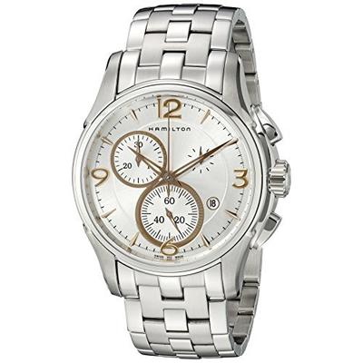 汉密尔顿 Hamilton Men's H32612155 Jazzmaster Silver Dial Watch 爵士大师瑞士制造三眼石英男表,这款来自汉密尔顿的腕表,内置一颗瑞士原产石英机芯,走时精准,基本不会出现时间误差,银白色表盘搭配银色不锈钢金属表壳,银色不锈钢表带,气质典雅,三眼计时,颇具型男风范,4点处带有日期功能,蓝宝石水晶玻璃镜面,耐磨防滑,日常使用基本不会出现磨损,42mm表径,带有100米的防水功能,可以戴着游泳,12点下方有Hamilton的字母logo,象征品牌魅力!