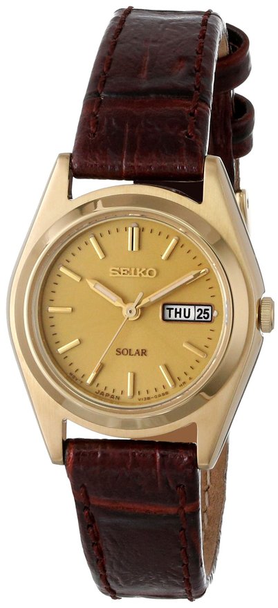 这款Seiko Women's SUT120 Analog Display Japanese Quartz Brown Watch精工镶钻时尚女表,采用日产V136太阳能机芯,吸收日常可见光作为能量来源。金色表盘搭配简约金色指针、时标,清新优雅。3点位置日期和星期显示,表盘直径25mm,厚度为8mm,耐磨聚合物表镜,棕色小牛皮表带,30米生活防水。