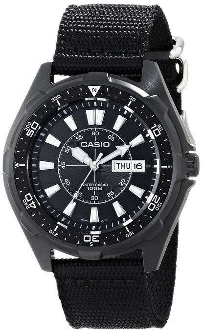 这款CASIO 卡西欧 AMW110-1AV 石英手表,表盘是黑色PVD不锈钢,配合黑色尼龙表带,尽显时尚休闲风。同时拥有可以双向旋转的PVD边框,指南针标记在边框的外缘,指针可发光,内圈有小时标记,星期何日期显示在3点钟位置。镜面采用耐划伤的矿物晶体,可有效防止划伤,直径50mm,厚12mm,带宽20mm,同时拥有100米防水功能。