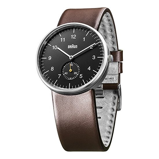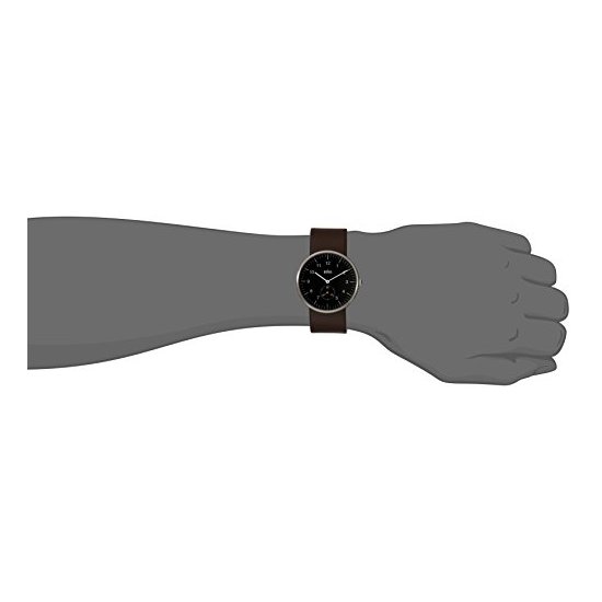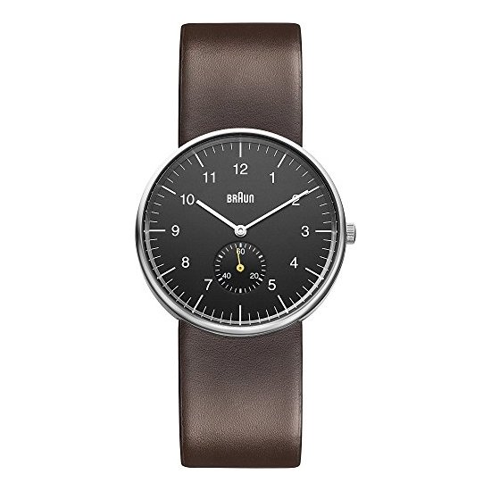 这款Braun Classic Analog Display Japanese Quartz Brown Watch博朗男士腕表型号为BN0024BKBRG,这款表采用了一颗日本制造的石英机芯,不仅走时精确而且极大减少了表的厚度,更为贴身优雅,这款表的表壳使用的是不锈钢材质制造,银白色的表壳内部是一个纯黑色的表盘,内敛大气,两针的走时方式更为典雅,在6点钟的位置还有个小开窗用来看秒针,优雅中又有一丝个性,真皮材质的表带更佳经典古朴,质感十足。表盘直径为38mm,50米的防水足够日常生活。